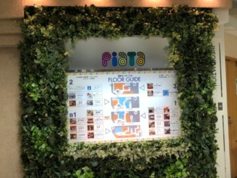 施設案内をLED映像にし、それを囲む形で壁面緑化 (フェイク) にしました。